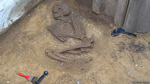 Um esqueleto humano, provavelmente da época da ocupação romana na Grã-Bretanha, foi descoberto em uma fossa de esgoto na região de Yorkshire, norte da Inglaterra.